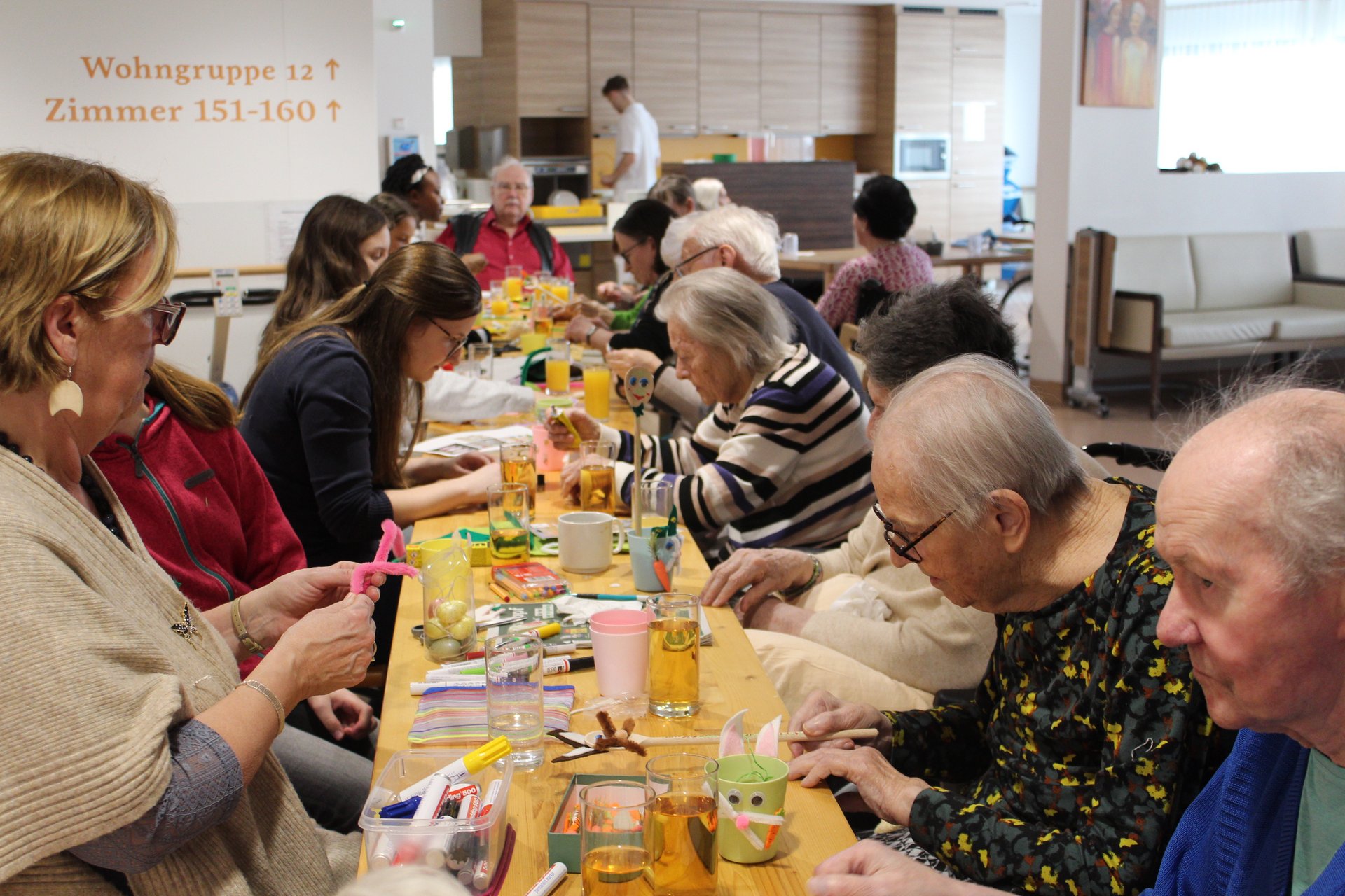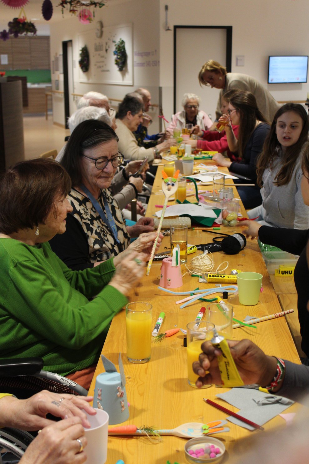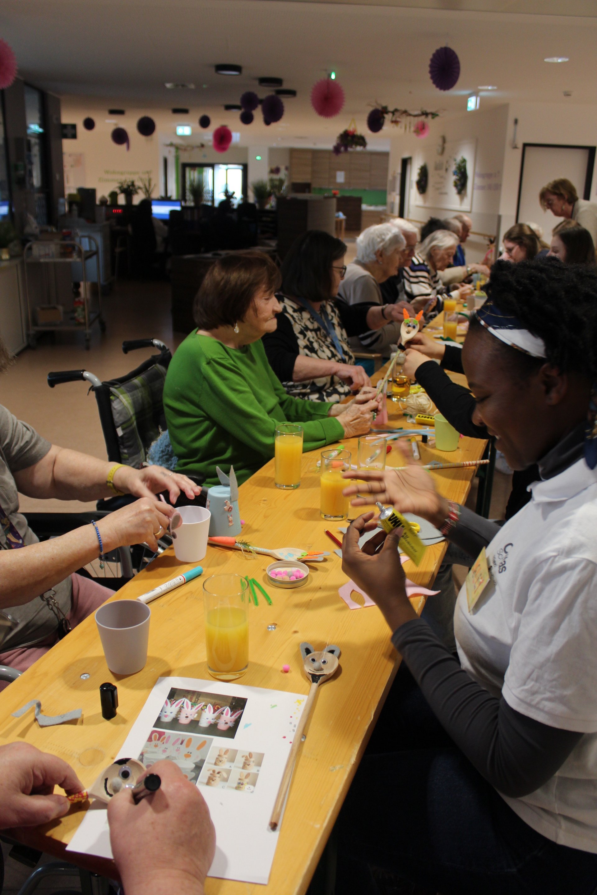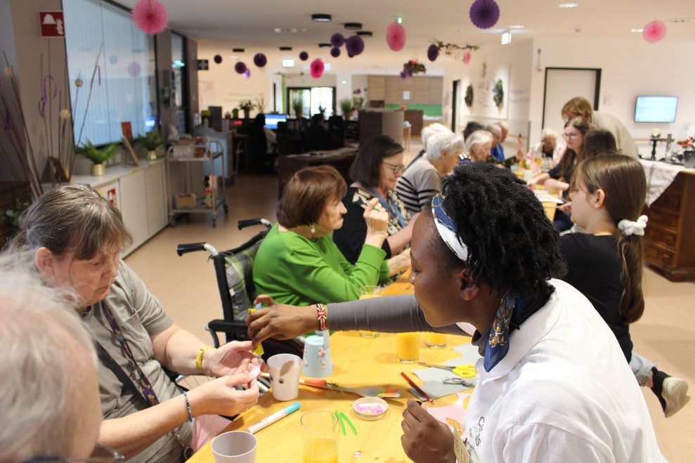 Der Frühling hält Einzug in unser Pflege- und Betreuungszentrum – und mit ihm die Vorfreude auf das bevorstehende Osterfest. In den vergangenen Tagen wurde bei uns eifrig gebastelt, gelacht und gemeinsam gestaltet. Ob in der Aktivierungsgruppe, wo Ostern zum lebendigen Thema wurde, beim Basteln auf der Psychosozialen Betreuung oder beim kreativen Miteinander mit Schülerinnen und Schülern der Mittelschule Pelzgasse Baden: Überall war die Freude am Tun spürbar. Die entstandenen Werke spiegeln nicht nur Kreativität und Engagement wider, sondern auch das wertvolle Miteinander zwischen den Generationen. Lassen Sie sich von unseren Fotos einen Eindruck dieser besonderen Momente vermitteln.
